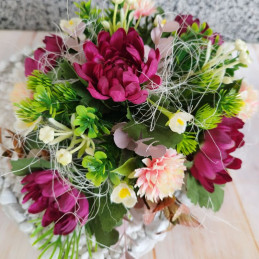 Srdiečko z kameniny vyplnené bielymi kamienkami. Zdobené rôznymi kvietkami a množstvom doplnkov.