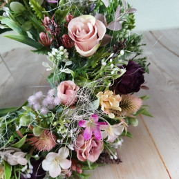 Veniec na dvere s plastovým základom zdobený prevažne rôznymi kvietkami a množstvom doplnkov.