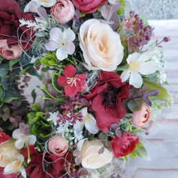 Veniec na dvere s plastovým základom zdobený rôznymi kvietkami a množstvom doplnkov.