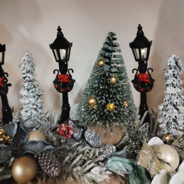 Vianočný svietnik na drevenom podklade. Zdobený svietiacimi lampami, 3D čečinou, stromčekmi a rôznymi doplnkami.