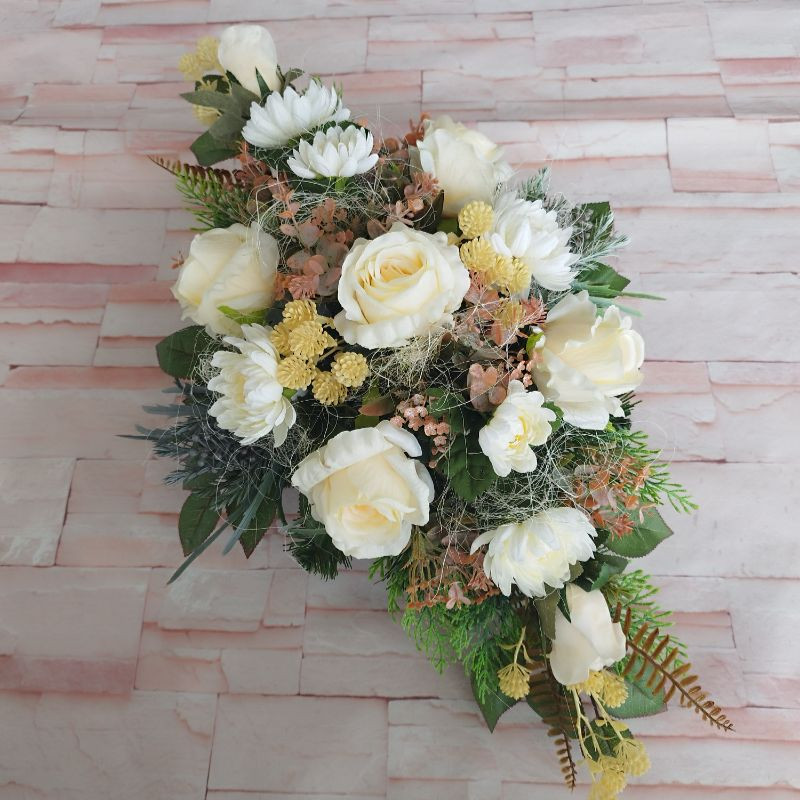Kytica na hrob podlhovastá v zaťaženom plastovom základe, zdobená rôznymi kvetmi a doplnkami.