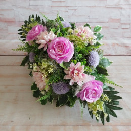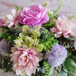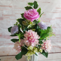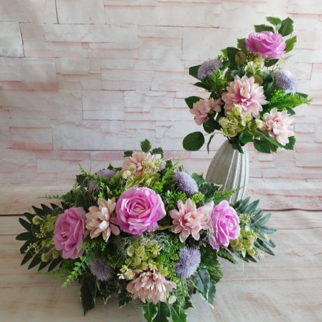 Set na hrob s ikebanou a kytičkou do vázy. Zdobený ružami, pivóniami a množstvom zelene a doplnkov.