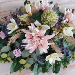 Zaťažená ikebana na umelom čečinovom základe. Zdobená prevažne svetlofialovými kvietkami a doplnkami.