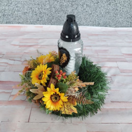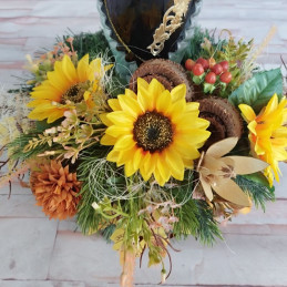 Náhrobná dekorácia s kahancom na umelom čečinovom základe okrúhleho tvaru. Zdobená je umelými slnečnicami a rôznymi doplnkami a sušinou.