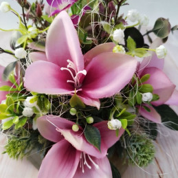 Dekorácia v plastovom základe zdobená fialovými kvietkami a doplnkami.